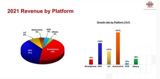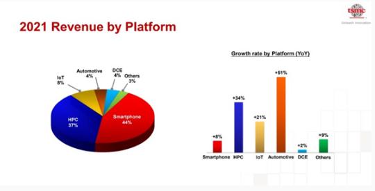 按平臺計算,臺積電 2021 年主要收入來(lái)源依舊來(lái)自于智能手機,其收入占比達 44%,其次是計算機,收入占比 37%,物聯(lián)網(wǎng)、汽車(chē)和數據通信設備分別占比8%、4%、4%。