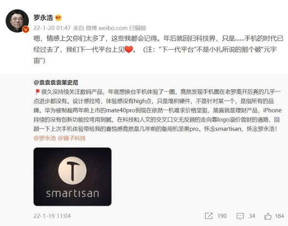 2021年10月,羅永浩曾稱(chēng)明年春天就重返科技行業(yè)了,而且是還完債的當天就會(huì )回去。今年1月20日羅永浩更是通過(guò)社交媒體表示,年后就回歸科技界,只是手機的時(shí)代已經(jīng)過(guò)去了,并稱(chēng)“下一代平臺上見(jiàn)”。