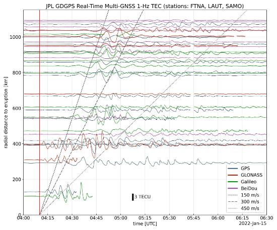 爆發(fā)還引起了海嘯,海嘯被爆炸的大氣壓力波所加強--這種現象被稱(chēng)為氣象海嘯( meteotsunami)。這些大浪造成的海洋表面的變形進(jìn)一步擾亂了電離層。GDGPS實(shí)時(shí)觀(guān)察到由爆炸和隨后的氣象海嘯引起的電離層擾動(dòng)。該系統通過(guò)跟蹤全球導航衛星系統(GNSS)信號穿越大氣層時(shí)的延遲來(lái)監測電離層中電子的密度(以總電子含量單位衡量,或稱(chēng)TECU)。