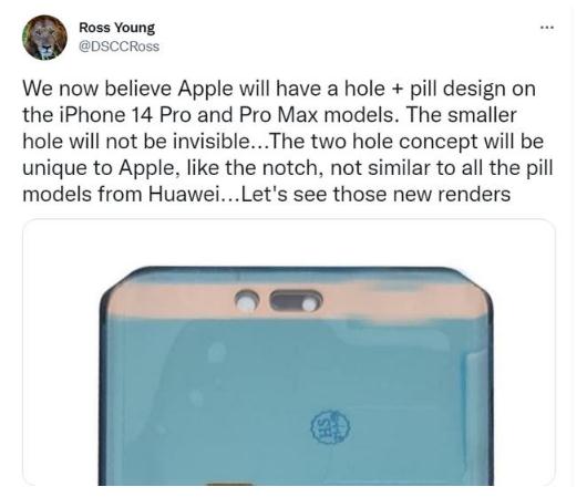 Ross Young也直言,希望這些孔會(huì )變得更小。今年早些時(shí)候,Ross Young便首次曝光了iPhone 14 Pro的“打孔 + 藥丸”設計,稱(chēng)iPhone 14 Pro 機型將在顯示屏頂部附近同時(shí)采用圓形和藥丸狀的打孔,形成一個(gè)類(lèi)似“感嘆號”的形狀。