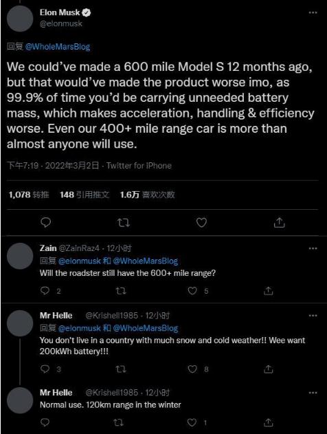 馬斯克在推文中說(shuō):“早在12個(gè)月前,我們本可以生產(chǎn)續航里程達900公里的Model S,但在我看來(lái),那會(huì )讓產(chǎn)品變得更糟,因為在99.9%的情況下,你會(huì )攜帶額外重量的電池,這會(huì )讓加速、操控和效率更差。即使我們640公里的續航里程,也幾乎超過(guò)了所有人的需求。”