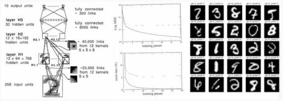 除了其使用的微型數據集(7291 個(gè) 16x16 的灰度數字圖像)和微型神經(jīng)網(wǎng)絡(luò )(僅 1000 個(gè)神經(jīng)元)顯得落伍之外,在 33 年后的今天,這篇論文讀來(lái)仍然十分新穎——它展示了一個(gè)數據集,描述了神經(jīng)網(wǎng)絡(luò )結構、損失函數、優(yōu)化器,并報告了在訓練集和測試集上實(shí)驗得到的錯誤率。