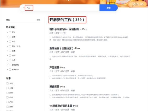除了內部轉崗,委派自己人掌控大局,Pico 社交中心也在積極對外選賢舉能。在字節跳動(dòng)的招聘官網(wǎng)上,Pico 目前開(kāi)放的招聘崗位多達 359,囊括了服務(wù)端開(kāi)發(fā)工程師、音視頻編碼高級工程師、VR 視頻體驗設計、Unity3D 架構師、圖像算法工程師、傳感器算法專(zhuān)家等各個(gè)崗位,分布地區包括北京、上海、深圳等。