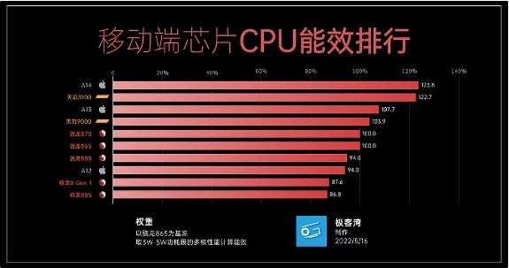 通過(guò)極客灣分享的移動(dòng)芯片能效排行榜來(lái)看,以驍龍 865 為基準,取 3W-5W 功耗段多核性能計算能效,數據顯示,蘋(píng)果 A14 當之無(wú)愧的位于排行榜榜首,達到了 123.8。不過(guò),第二名竟然是聯(lián)發(fā)科的天璣 8100,以 122.7 的成績(jì)相當接近第一名的蘋(píng)果 A14,并且遠超高通陣營(yíng),堪稱(chēng)安卓最節能處理器。