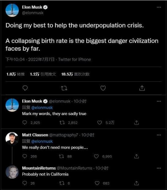 他在推特上寫(xiě)道:“ 我正在盡最大努力幫助解決人口危機。出生率下降是人類(lèi)文明目前面臨的最大危險。”