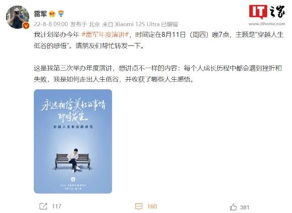 小米創(chuàng )辦人、董事長(cháng)兼 CEO 雷軍通過(guò)社交媒體表示,計劃舉辦今年雷軍年度演講,時(shí)間定在 8 月 11 日(周四)晚 7 點(diǎn),主題是“穿越人生低谷的感悟”。雷軍表示,這是他第三次舉辦年度演講,想講點(diǎn)不一樣的內容,“每個(gè)人成長(cháng)歷程中都會(huì )遇到挫折和失敗,我是如何走出人生低谷,并收獲了哪些人生感悟。”
