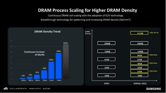 為了支持英特爾和 AMD 下一代平臺,三星準備推出一系列全新的 DDR5 內存模塊,比如基于 16Gb 和 24Gb 的 DDR5 芯片的業(yè)界首款 512GB RDIMM/LRDIMM。在近期三星和 AMD 的內存研討會(huì )上,雙方探討了 DDR5 內存技術(shù)上的新方向,同時(shí)三星透露了其 DDR5 的開(kāi)發(fā)計劃。