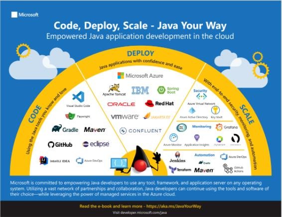 Azure 的多項基礎設施是與 Java 生態(tài)系統中的主要供應商合作建立,如與 Pivotal / VMWare 聯(lián)合開(kāi)發(fā)的 Azure Spring Apps,其他像 Azure App Service 上的 Red Hat JBoss EAP、WebSphere Application Server、WebSphere Liberty 和 Azure 上的 Open Liberty、Azure VM 上的 Oracle WebLogic Server 和 Azure Kubernetes Service 和 Apache Kafka for Confluent Cloud 等。 Azure 還可以與 Maven、Gradle、Eclipse Toolkit 等?具?縫協(xié)作。