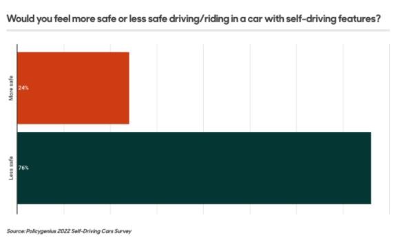 保險平臺 Policygenius 進(jìn)行的一項最新調查發(fā)現,四分之三的美國人覺(jué)得駕駛或乘坐具有自動(dòng)駕駛功能的汽車(chē)不安全。同樣地,73% 的受訪(fǎng)者在得知其他人駕駛的是自動(dòng)駕駛汽車(chē)時(shí)也感到不安全。Policygenius 此次調查針對的是大約 1500 名 18 歲以上的美國居民。