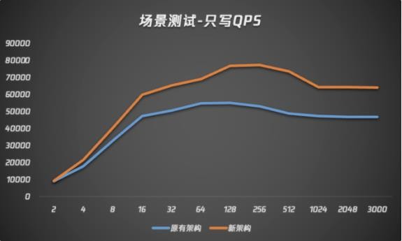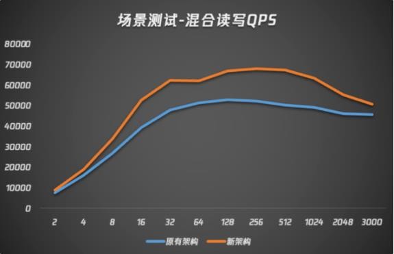 在只寫(xiě)場(chǎng)景下,搭載了新一代內核的騰訊云數據庫 MySQL 性能隨線(xiàn)程數增加而始終高于上一代版本,線(xiàn)程數為 256 時(shí)達到最高 QPS,且在線(xiàn)程數為 512 時(shí),在新內核加持下 QPS 達到超過(guò) 20% 的提升。