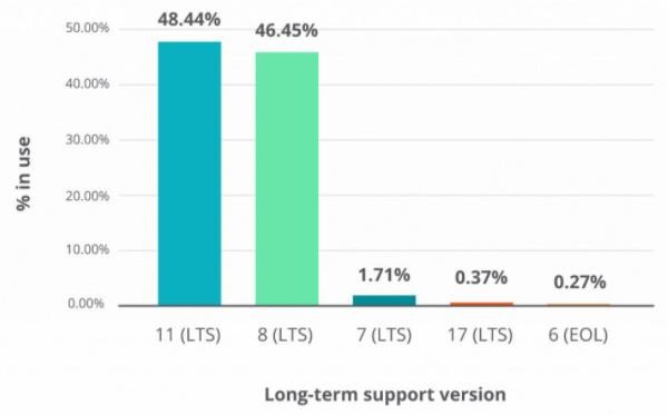 最新的一個(gè)長(cháng)期版本 Java 17 排名還不是很高,但它在發(fā)布后的幾個(gè)月里,已經(jīng)超過(guò)了 Java 6、Java 10 和 Java 16 版本的占比。