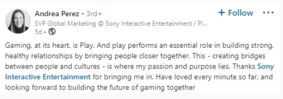 2022 年 9 月,前耐克全球副總裁兼喬丹女子部總經(jīng)理安德烈-佩雷斯成為索尼互動(dòng)娛樂(lè )(SIE)/PlayStation 的全球營(yíng)銷(xiāo)高級副總裁。這一消息被多家媒體以及 SVP 的領(lǐng)英爆出,佩雷斯就她在耐克的工作和她在 SIE 的新角色進(jìn)行了分享。