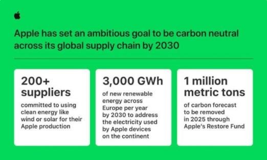 據蘋(píng)果稱(chēng),該公司已于 2020 年開(kāi)始實(shí)現全球公司運營(yíng)碳中和。同時(shí)蘋(píng)果在全球范圍內的 200 多家供應商已承諾 100% 使用可再生能源來(lái)生產(chǎn)蘋(píng)果產(chǎn)品,這其中包括了如京東方、立訊精密等在內的 55 家中國供應商。