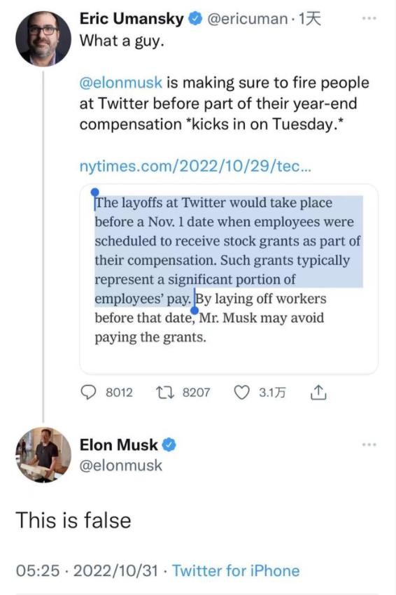 周日有推特用戶(hù)向馬斯克求證,是否決定要在本周二向一些推特員工發(fā)放部分年終獎前進(jìn)行裁員。馬斯克回應稱(chēng):“這是假的。”