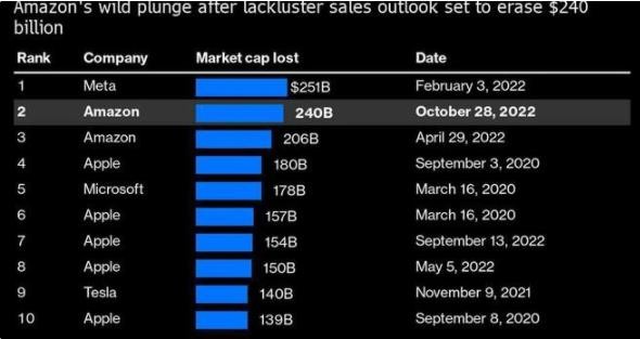 亞馬遜股價(jià)周五一度下跌 12%,此前這家電商巨頭預計今年假日季營(yíng)收增長(cháng)將是該公司史上最低水平,而其重要的網(wǎng)絡(luò )服務(wù)業(yè)務(wù)營(yíng)收也將低于預期。這使得亞馬遜的市值跌至約 9950 億美元(約 7.18 萬(wàn)億元人民幣),隨后該股反彈,收盤(pán)時(shí)下跌 6.8%。
