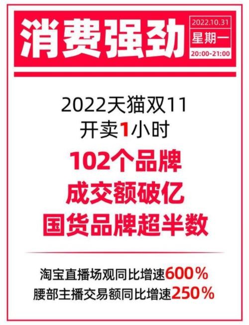 天貓雙 11 第一波售賣(mài)正式開(kāi)啟。銷(xiāo)售 1 小時(shí),102 個(gè)品牌成交額過(guò)億元。