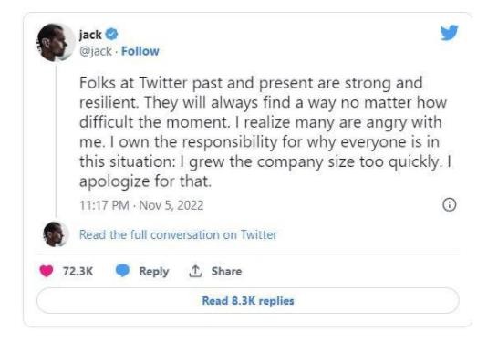 多西在推文中寫(xiě)道:“推特過(guò)去和現在的員工都很堅強。不管遇到多么困難的情況,他們總會(huì )找到辦法解決。我知道,很多人都對我感到不滿(mǎn),我應該對他們如今的處境負有責任,畢竟是我讓公司擴張得太快了。我對此深表歉意。”