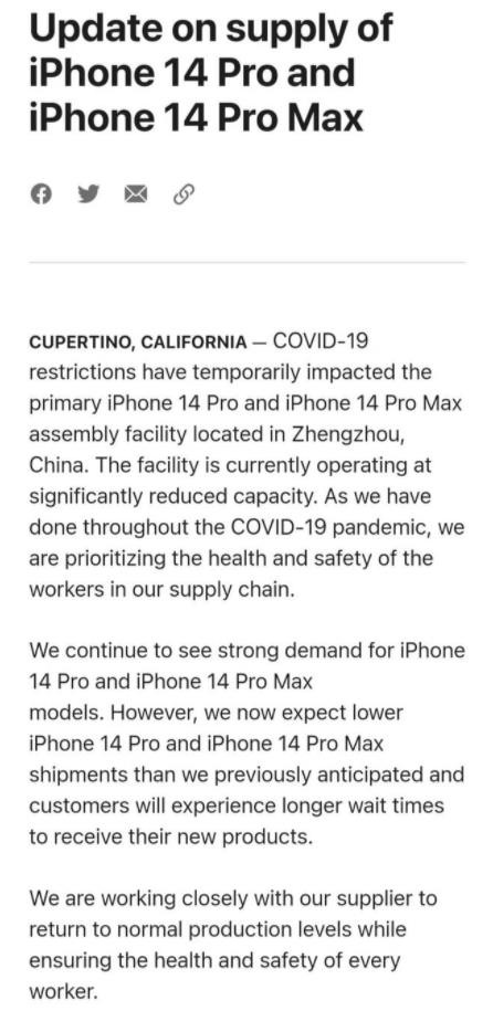 蘋(píng)果對 iPhone 14 Pro 和 iPhone 14 Pro Max 目前的供應情況做出最新聲明。蘋(píng)果稱(chēng),富士康鄭州工廠(chǎng)目前的產(chǎn)能大幅降低,iPhone 14 Pro 和 iPhone 14 Pro Max 的出貨量將低于預期。