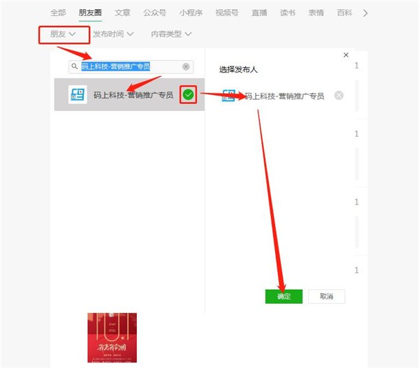 3.如果想搜索某個(gè)好友的朋友圈就再下方朋友的標簽中進(jìn)行輸入篩選,搜索出想要看的好友之后選擇上發(fā)布人,點(diǎn)擊確定即可搜索到該好友發(fā)的朋友圈內容。