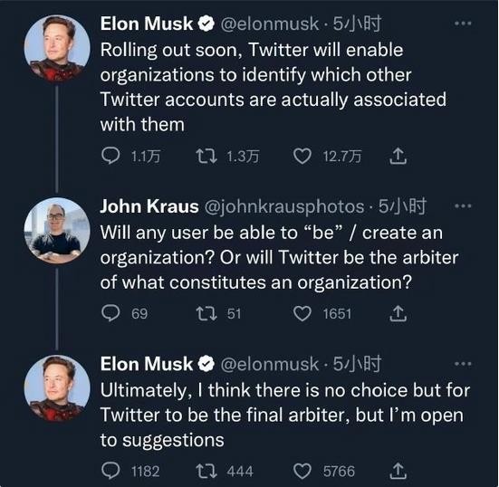 馬斯克稱(chēng):“很快就會(huì )推出。Twitter 將會(huì )允許組織機構認證與它們真正有關(guān)聯(lián)的其它 Twitter 賬戶(hù)。”