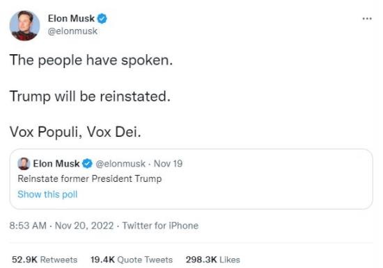在得到這一結果后,馬斯克發(fā)布消息,稱(chēng)自己將根據網(wǎng)民們的意愿解封特朗普的個(gè)人賬號,他還用一句拉丁語(yǔ)格言表達了自己對這一決定的看法:Vox Populi, Vox Dei.(意為“人民的聲音就如同神的旨意”)。