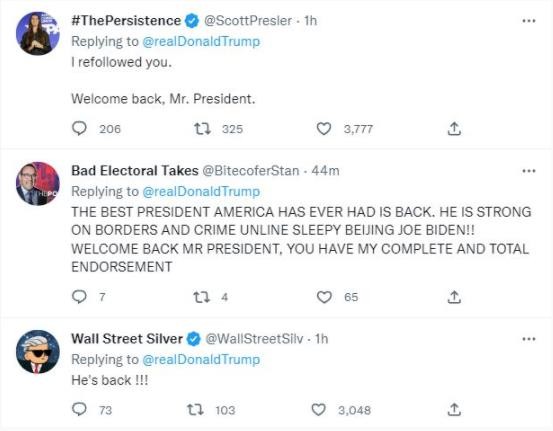 據筆者查詢(xún),截至發(fā)稿時(shí),特朗普的個(gè)人賬號已經(jīng)恢復了正常展示的狀態(tài),且已允許用戶(hù)轉發(fā)和評論,不少特朗普的支持者已經(jīng)在評論區留言“歡迎回來(lái)”。