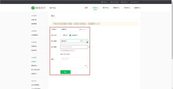 2.進(jìn)入到支付平臺后,點(diǎn)擊橫向菜單的交易中心,然后在左側菜單中點(diǎn)擊充值/轉入,就可以看到操作頁(yè)面了
