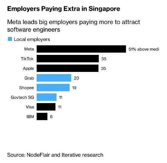 上述報告顯示,在新加坡科技行業(yè),從業(yè)者最向往的幾家公司包括字節跳動(dòng)、新加坡政府技術(shù)局,以及前述互聯(lián)網(wǎng)巨頭 Sea 旗下的電子商務(wù)子公司 Shopee,這些公司的吸引力超過(guò)了蘋(píng)果、維薩卡和 Meta 等海外公司。