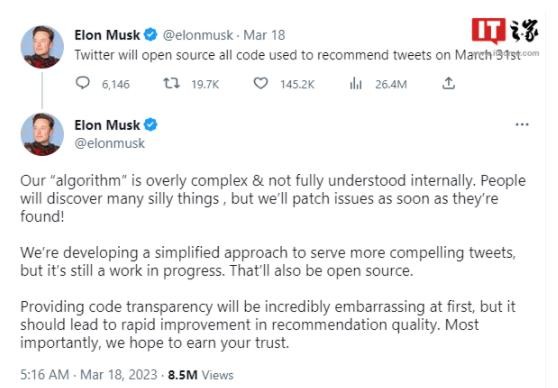 馬斯克近日發(fā)布推特表示,推特將于 3 月 31 日開(kāi)源所有用于推文推薦機制的代碼。