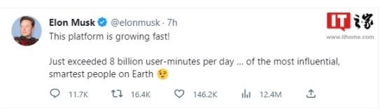 馬斯克今日還發(fā)推文稱(chēng),“推特的增速很快,每天所有用戶(hù)在該平臺上的總分鐘數已經(jīng)達到 80 億。”