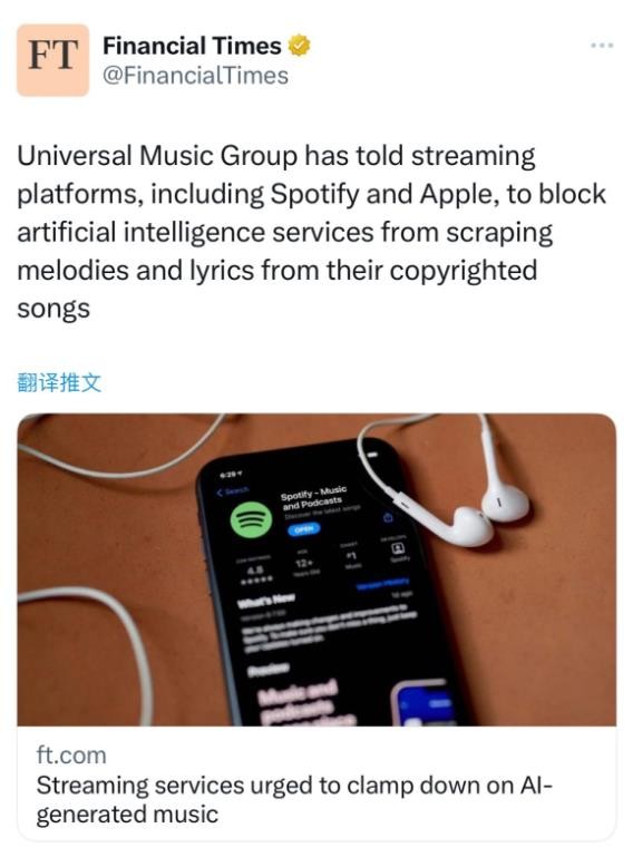 環(huán)球音樂(lè )集團已告知包括 Spotify 和蘋(píng)果在內的流媒體平臺,應防止人工智能服務(wù)從其受版權保護的歌曲中抓取旋律和歌詞。