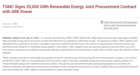 IT之家從臺積電官網(wǎng)獲悉,臺積電繼 2020 年后成為全球第一家加入全球再生能源倡議組織(RE100)的半導體企業(yè),首創(chuàng )再生能源聯(lián)合采購的 ESG 創(chuàng )新模式。