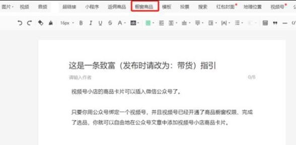 想要開(kāi)啟該功能,用戶(hù)需要用公眾號綁定一個(gè)開(kāi)啟了商品櫥窗權限的公眾號,之后在公眾號內容編輯頁(yè),點(diǎn)擊上方功能欄"櫥窗商品",選擇要插入的商品即可插入到文章中。