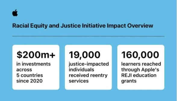 蘋(píng)果在今天發(fā)布的新聞稿中,表示在過(guò)去 3 年時(shí)間里,投資 REJI 計劃超過(guò) 2 億美元,其金額比 2020 年初期的承諾翻番。