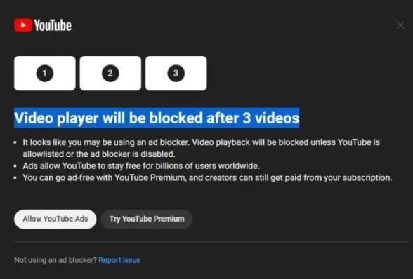 YouTube 正在進(jìn)行一項新的實(shí)驗,旨在限制廣告攔截器的使用,要求用戶(hù)在觀(guān)看三個(gè)視頻后關(guān)閉廣告攔截器或者購買(mǎi)高級訂閱服務(wù)。