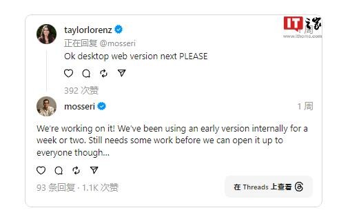 IT之家注意到,Instagram 負責人 Adam Mosseri 周五在他的 Instagram 個(gè)人主頁(yè)上表示,Threads 的網(wǎng)頁(yè)版即將推出,并已在 Meta 內部進(jìn)行測試。