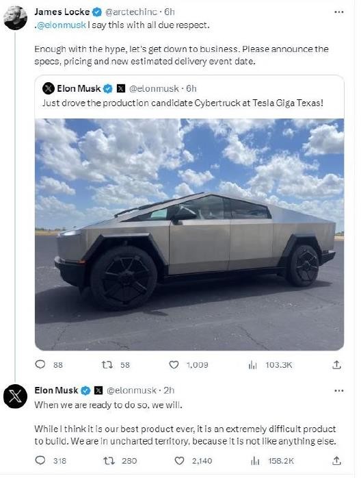特斯拉 CEO 埃隆·馬斯克當地時(shí)間周三發(fā)貼稱(chēng),他剛剛在特斯拉德州超級工廠(chǎng)試駕了一輛量產(chǎn)版 Cybertruck。一位X用戶(hù)評論稱(chēng):“我這么說(shuō)完全是出于尊重。炒作夠了,我們開(kāi)始談?wù)掳?。請公布規格,價(jià)格和新的預計交付日期。”