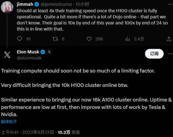 這位名為“jimmah”的用戶(hù)表示:“一旦特斯拉的 H100 集群完全投入使用,特斯拉的訓練速度應該至少提高 4 倍。如果有很多 Dojo 上線(xiàn)的話(huà),會(huì )更快一點(diǎn) —— 但這部分我們不知道。特斯拉的目標是到今年年底達到 10 倍,到 2024 年底達到 100 倍,所以這與他們的目標一致。”