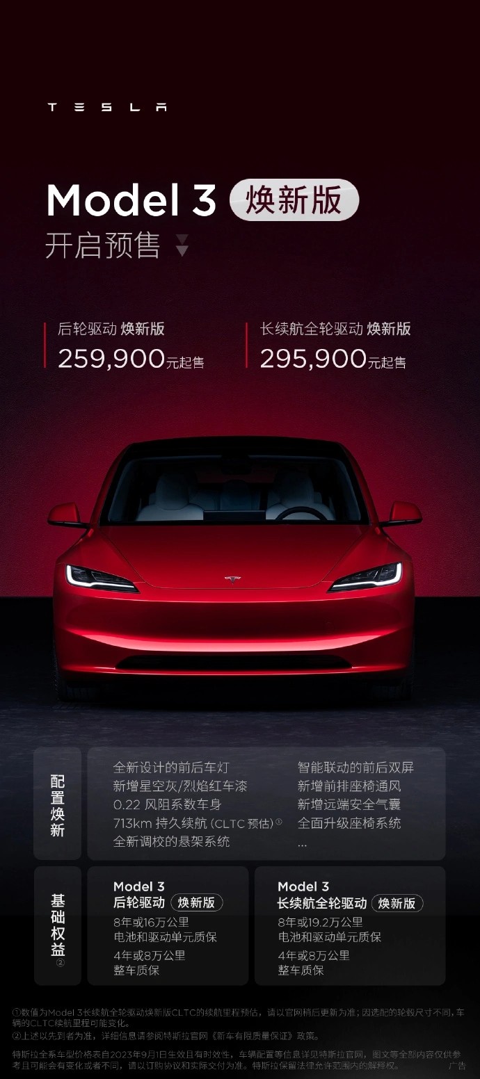 Model 3 煥新版:25.99 萬(wàn)元(后輪驅動(dòng))