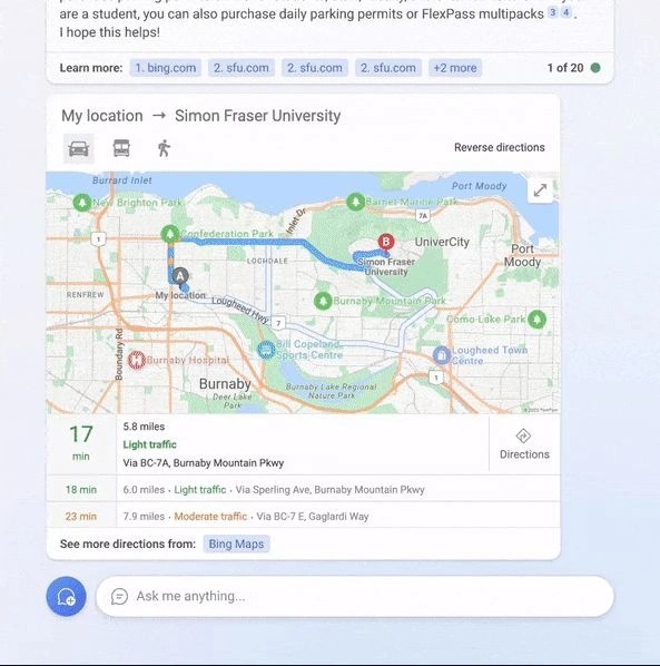 微軟在博文中表示,用戶(hù)和必應聊天,內容中不僅提供到達目的地的最優(yōu)路徑,還會(huì )在地圖中顯示相關(guān)路徑。