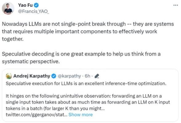 介紹完「Speculative decoding」,我們再回到 Karpathy 的推特。Karpathy 是針對下面內容回復的。