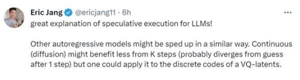 人形機器人公司 1X Technologies 的 AI 副總裁 Eric Jang 評價(jià)道:「Karpathy 很好的解釋了 LLM 的 speculative execution。其他自回歸模型可能會(huì )以類(lèi)似的方式加速。連續(擴散)模型可能從 K 步中獲益較少(可能在第 1 步后偏離猜測),但可以將其應用于 VQ-latents 的離散代碼?!?/p>