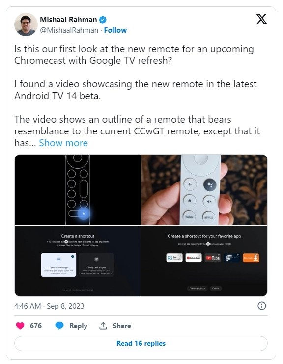 開(kāi)發(fā)者 Mishaal Rahman 深入挖掘安卓 TV 14 Beta 代碼,暗示谷歌即將推出新款 Chromecast with Google TV 設備,并發(fā)現了相關(guān)的遙控器示意圖。
