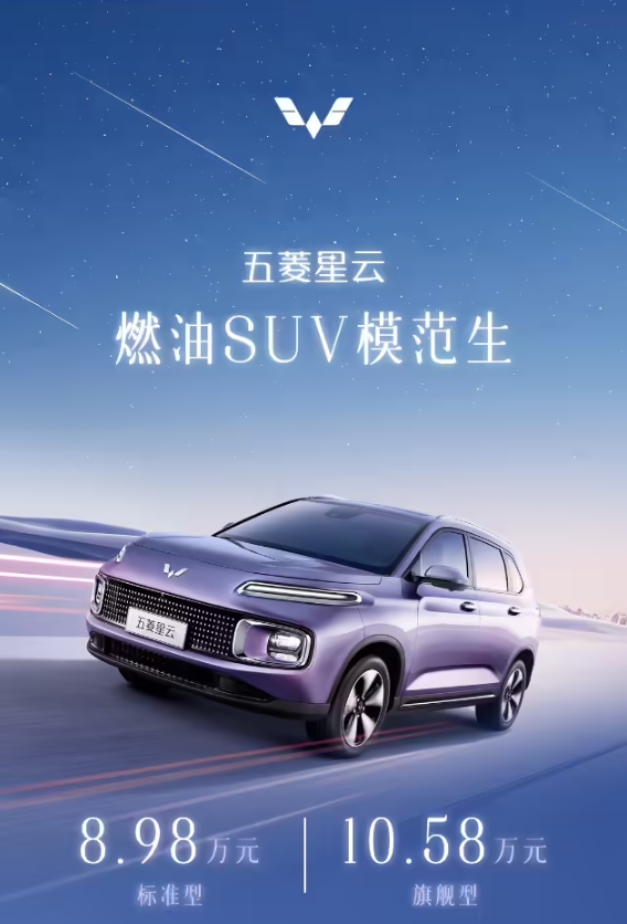 五菱星云汽車(chē)官宣今日上市,推出標準型、旗艦型兩款配置,官方指導價(jià)分別為 8.98 萬(wàn)元、10.58 萬(wàn)元,定位 5 座油電混動(dòng)緊湊型 SUV。