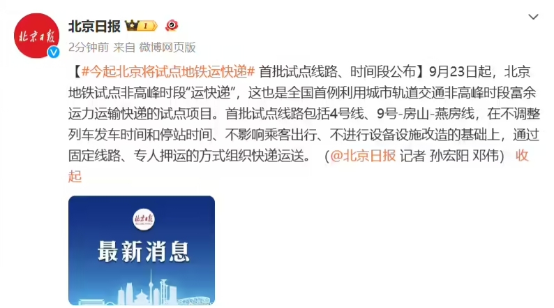 全國首例,北京地鐵今日起試點(diǎn)非高峰時(shí)段“運快遞” 08:55:28