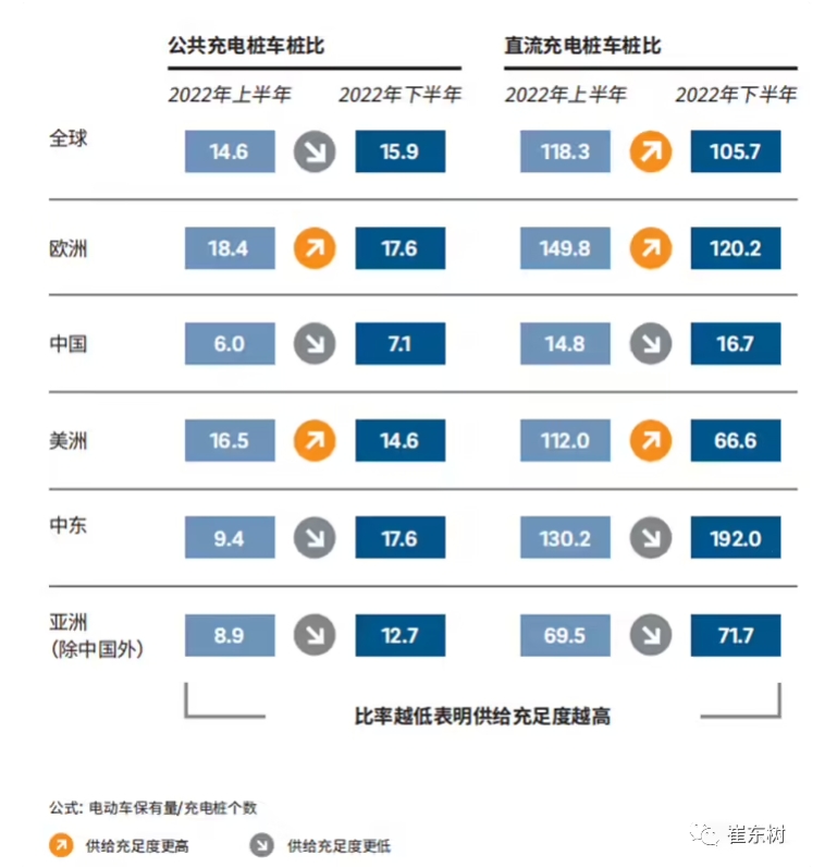 中國領(lǐng)先全球的充電基礎設施的成就突出。根據國際調研公司報告分析,中國 2022 年下半年的公共充電樁的車(chē)樁比是 7:1,美洲是 14.6:1,歐洲 17.6:1,而直流公共充電樁的對比看,中國是 16.7:1,全球是 105:1,歐洲是 120:1,美洲是 66:1。