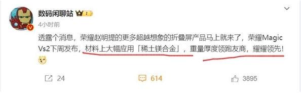博主數碼閑聊站透露,榮耀新款折疊屏Magic Vs2即將發(fā)布,這款新品應用了稀土鎂合金,重量厚度將會(huì )再創(chuàng )新紀錄,遙遙領(lǐng)先友商。