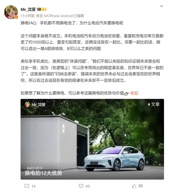 在其同時(shí)發(fā)出的另一條微博中,沈斐對“手機都不用換電池了,為什么電動(dòng)汽車(chē)還要換電”作出解答:這個(gè)問(wèn)題本身就不成立,手機電池、汽車(chē)動(dòng)力電池在容量、重量和充電功率方面都差了 1000 倍以上,是典型的“休謨問(wèn)題”: