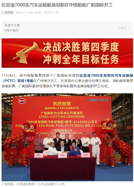 廣船國際公眾號發(fā)文,由中國船舶集團旗下廣船國際承接的比亞迪 7000 車(chē)雙燃料汽車(chē)運輸船(PCTC)項目 1 號船在廣州南沙開(kāi)工。