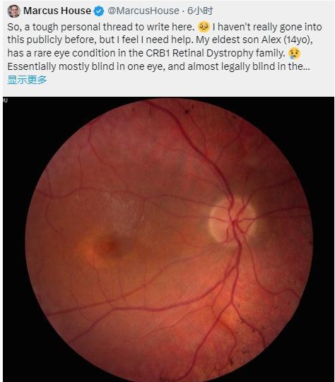 事情是這樣的,周二知名澳洲科技媒體人 Marcus House 在社交媒體上發(fā)文稱(chēng),他 14 歲的大兒子亞歷克斯患有 CRB1 視網(wǎng)膜營(yíng)養不良癥這一罕見(jiàn)的眼病。